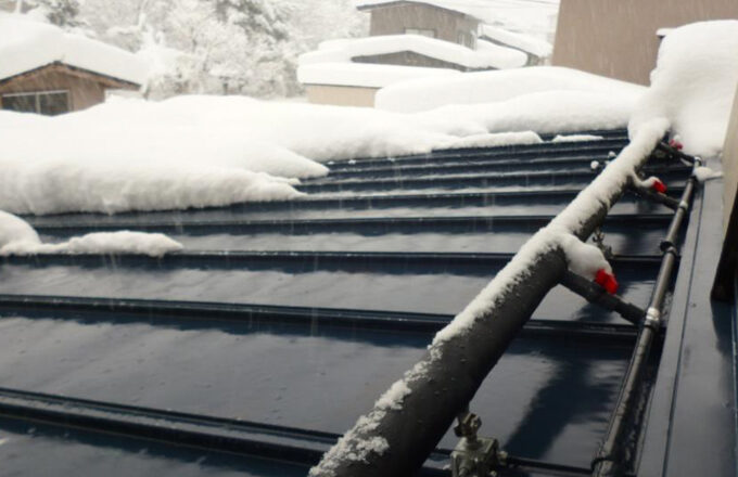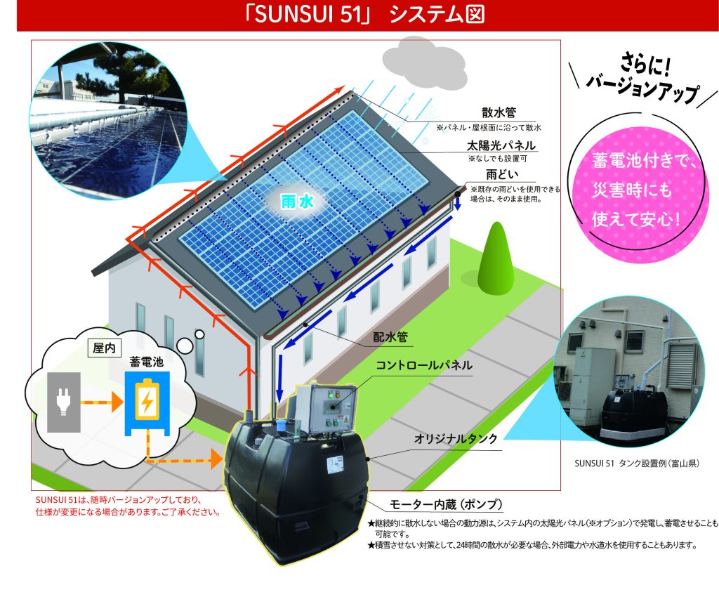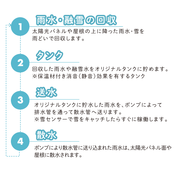 雪を自動で検知し、貯水していた雨水を加温し、屋根や太陽光パネルに散水します。